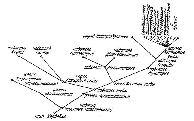 Рис. 1. Положение основных групп рыб в системе животных (по Наумову, Карташеву, 1979, с сокращениями)