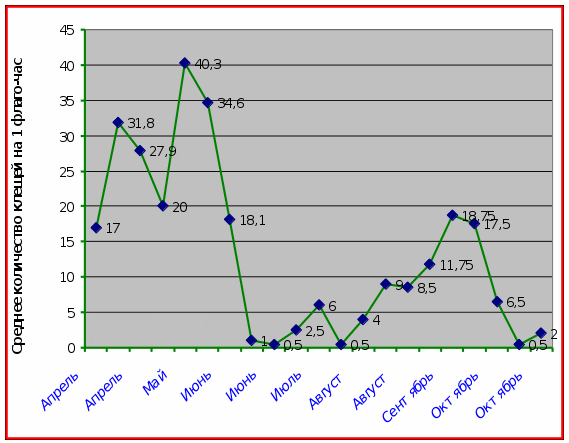По другим данным максимальный подъём численности Ixodes ricinus приходится на май и на последнюю декаду июня или на июль месяц [2,9,10].