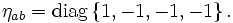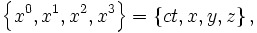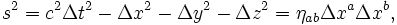Аналог расстояния между событиями в пространстве Минковского, называемый интервалом, при введении наиболее простых координат, аналогичных декартовым координатам трёхмерного пространства, даётся выражением: