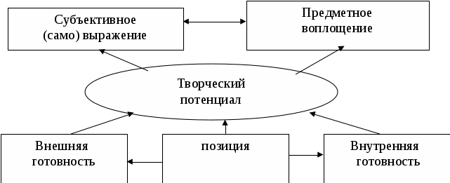 Сочетание исследовательской позиции и творческого потенциала открывает возможность осуществления творчества, которое может быть представлено в форме предметных воплощений (произведения науки, культуры, искусства) или субъектного самовыражения, необходимого для нахождения личностью своего предназначения и определения собственного смысла жизни. В соответствии с концепциями Л.С. Выготского [46], Л.С. Рубинштейна [185], А.К. Абульхановой-Славской [3], Я.А. Пономарева [169], И.Б. Котовой, Е.Н. Шиянова [109] и др., в данном процессе личность реализует адекватные ее природе потребности созидания, воплощающиеся в свободное личностное структурирование жизни и ее условий [3], в придание формы несовершенному миру как следствия исследования Бытия (Н.А. Бердяев). Однако мы поддерживаем в данном вопросе позицию Г.Г. Панковой [155], утверждающей, что творческий акт – это опредмечивание соответствующими средствами родившегося в голове творца образа, конструкции или идеи, причем такой идеи и образа, которые "отражают уникальные, неповторимые свойства творца, его душу" [155, с.21]. По нашему мнению, творчество не только удовлетворяет потребности созидания материального в мире, но и является способом выражения и воплощения личности себя в жизни, в ее творческом построении. Проявление изучаемых процессов можно наблюдать не только в "высших выражениях творчества" - Л.С. Выготский ("предельных переживаниях" - А. Маслоу, "пограничных ситуациях" - К. Ясперс, "точках бифуркации" -современная теория синергии Е.Н. Князевой, С.П. Курдюмова, В.И. Аршинова), но и в так называемом "каждодневном творчестве" [44], связанным с постоянным поиском и исследованием внутреннего центра духовной жизни, с самостоятельной выработкой мировоззрения, системы ценностей и образа действий человека.