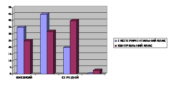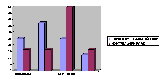 Дані таблиці показують, що в експериментальному класі учнів із високим рівнем навчальних досягнень на 13,5% більше, ніж у контрольному класі, а учнів із достатнім рівнем на 13% більше. В експериментальному класі учнів із середнім рівнем на 17,5% менше, ніж у контрольному класі. В експериментальному класі учнів із початковим рівнем немає, а в контрольному – 9%.