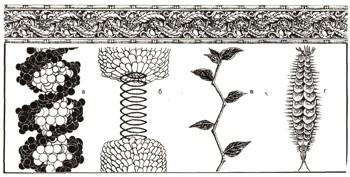 Рис. 1. Одномерная симметрия: а — модель молекулы ДНК; б — модель вируса табачной мозаики; в — побег традесканции; г — полихета; наверху — бордюр