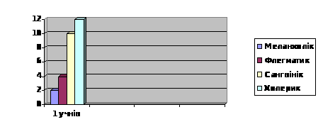 Тобто судячи з діаграми,дійсно ми бачимо що за темпераментом,на першому місці переважають холерики, їх є 12 учнів, наступними є сангвініки, її кількість налічує 10 учнів. Також в класі присутні Флегматики - 4 учнів і меланхоліки – 2 учня.