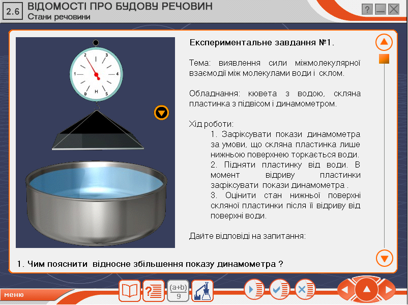 (Після самоперевірки учні проводять експериментальне завдання з метою виявлення сили міжмолекулярної взаємодії між молекулами води і склом. Див. мал.6)