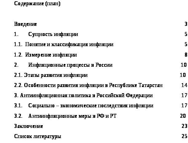 Так, например, по теме курсовой работы "Инфляция в России: причины, характер, перспективы" можно рекомендовать следующий примерный план:
