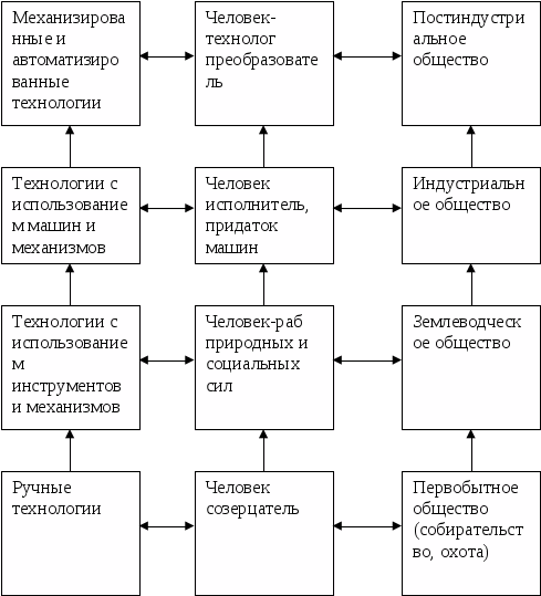 С появлением универсальной техники технологии стали доминировать, а способы производства начали различаться своими технологиями. Технология является средством и критерием развития общества и человека, что показано на следующем рисунке.