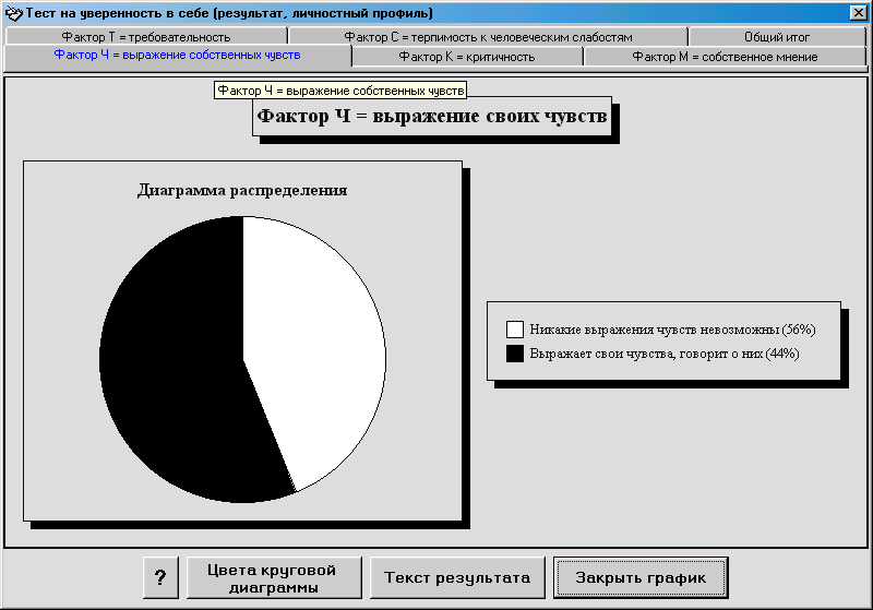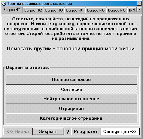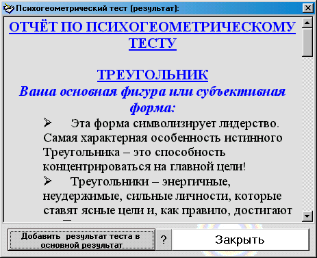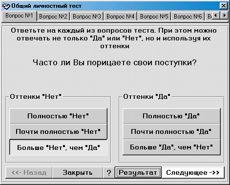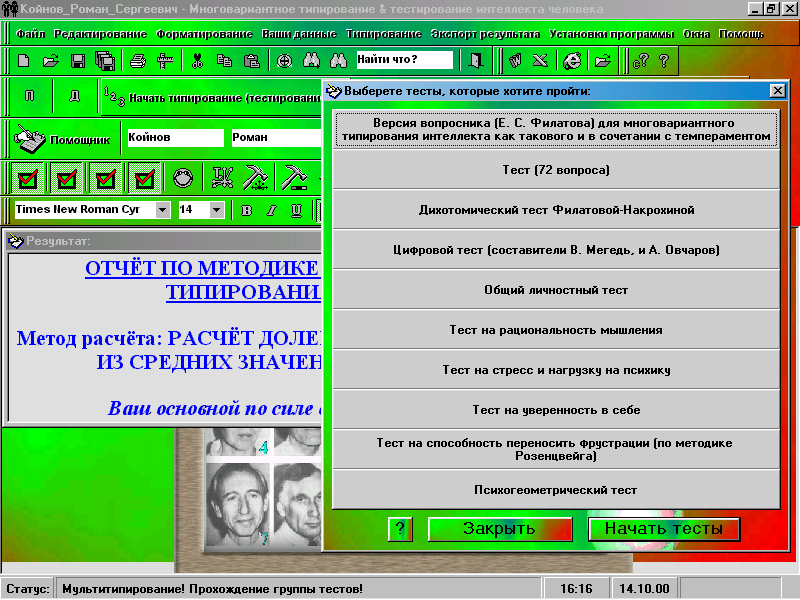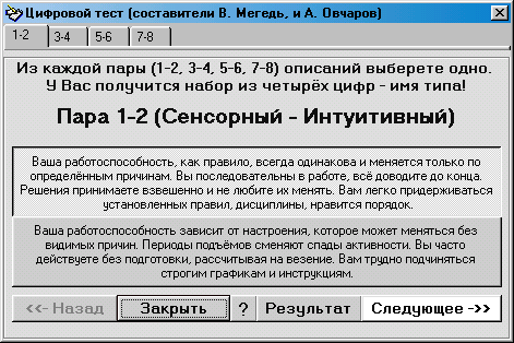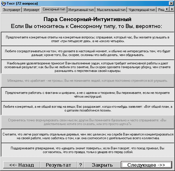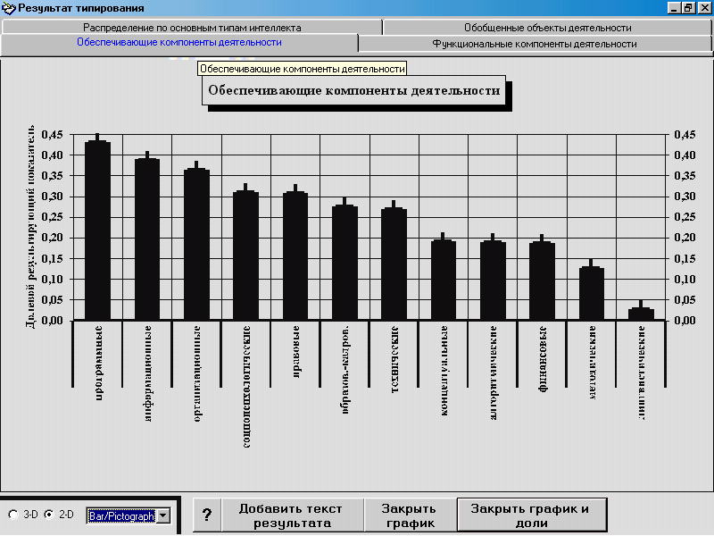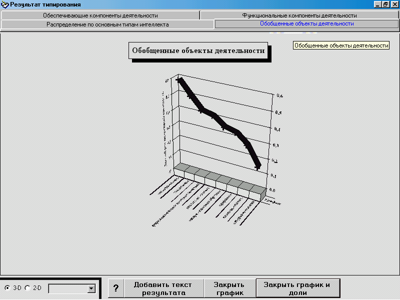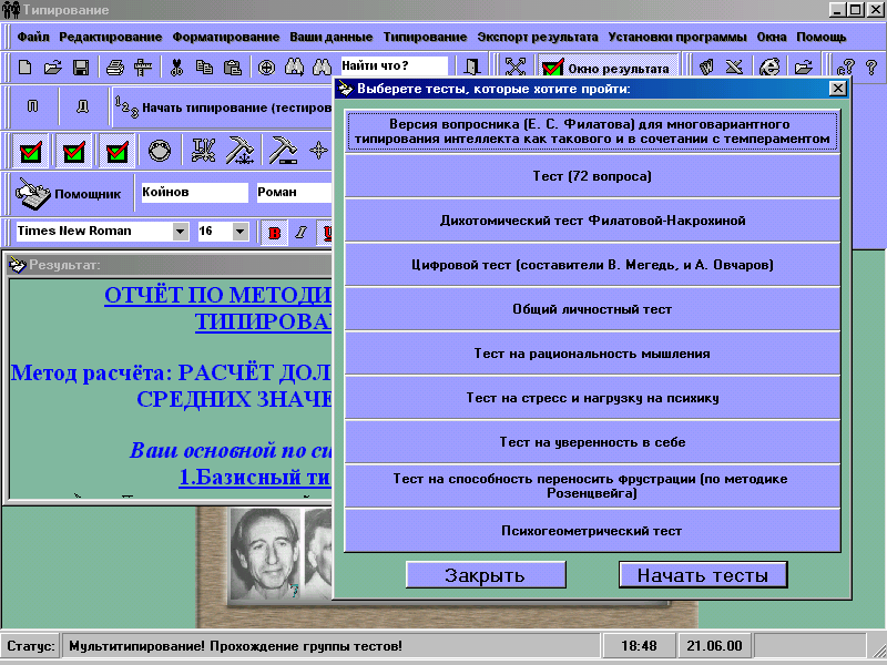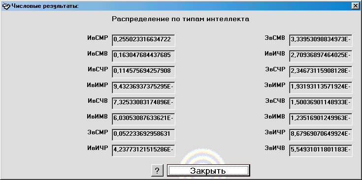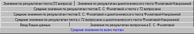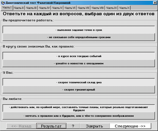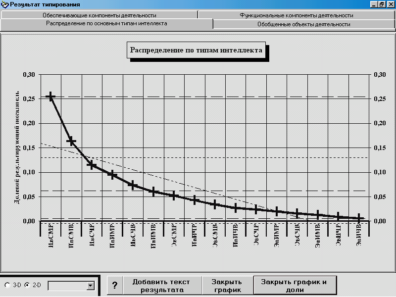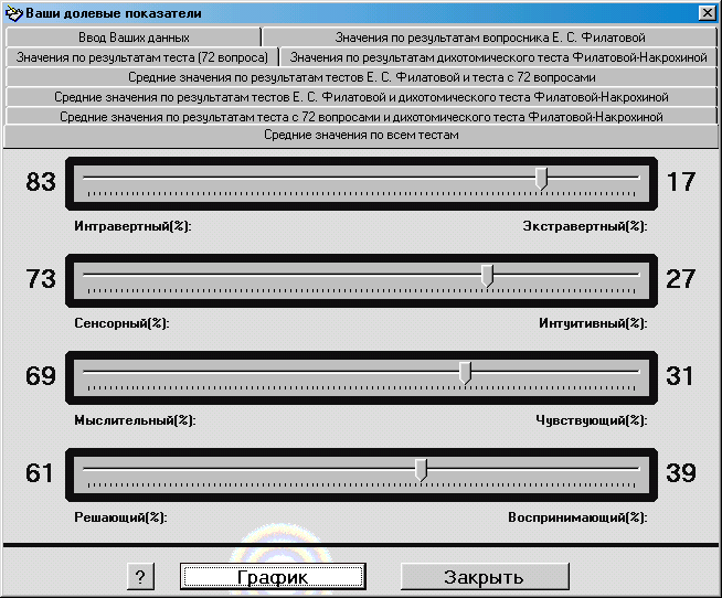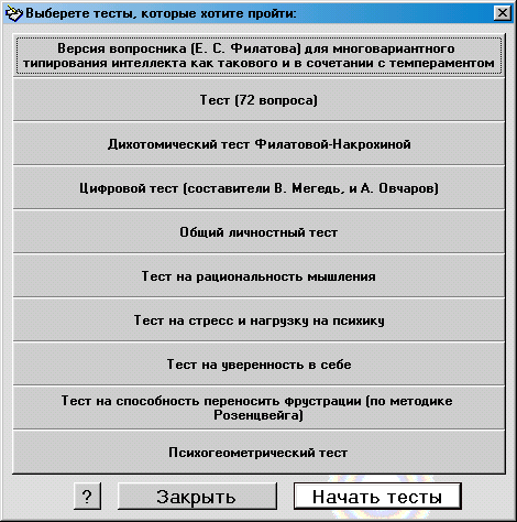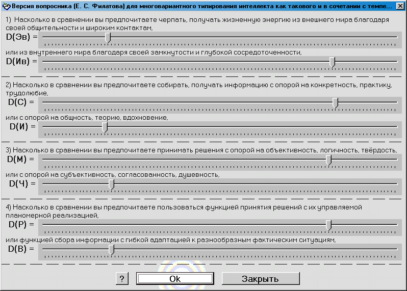 * К тестам многовариантного типирования интеллекта относятся первые три теста: версия вопросника Филатовой Е.С. для многовариантного типирования интеллекта как такового и в сочетании с темпераментом, тест (00 вопроса), дихотомический тест Филатовой-Накрохиной. Результат этих тестов рассчитывается и отображается в форме расчёта долевых показателей (рис. 0.0).