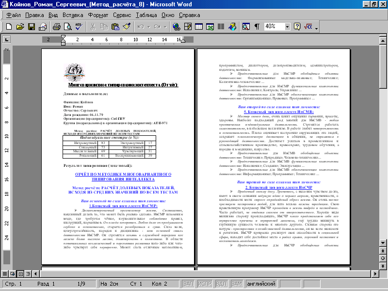 Приложение 9. ОТЧЕТ ПО МЕТОДИКЕ КОМПЛЕКСНОГО ИССЛЕДОВАНИЯ ЛИЧНОСТИ С ГИБКОЙ ПРОФОРИЕНТАЦИЕЙ