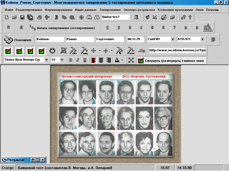 разработка опросных карт и технология применения программного Интернет комплекса тестирования интеллекта человека с гибкой профориентацией в МОУ для детей межшкольный учебный комбинат;