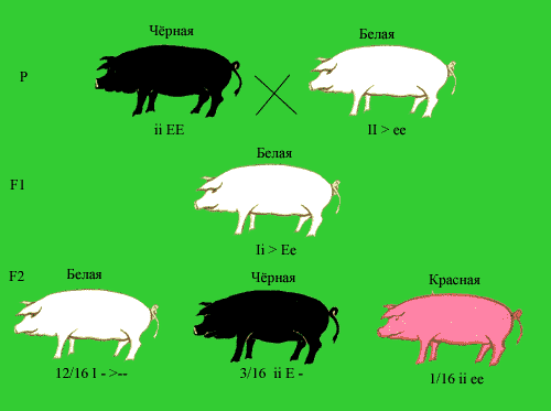 Эпистатическое взаимодействие неаллельных генов в определенном смысле противоположно комплементарному действию генов. Сущность эпистаза сводится к подавлению проявления генов одной аллельной пары генами другой. Гены, подавляющие действие других неаллельных генов, называются супрессорами или подавителями. Они могут быть как доминантными, так и рецессивными, например А - В- или bbA - . Наследование окраски у свиней демонстрирует доминантный Эпистаз. При скрещивании черных и белых свиней из разных пород в F1 появляются белые потомки. Их скрещивание между собой приводит к появлению белых (12/16), черных (3/16) и красных (1/16) поросят. Все белые поросята имеют минимум один доминантный генподавитель I. Черные поросята гомозиготны по рецессивному аллелю i, не препятствующему формированию окраски, и несут доминантный аллель Е, детерминирующий образование черного пигмента. Красные поросята (eeii) лишены доминантного геноподавителя I и доминантного гена, определяющего черную окраску.