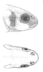 Расположение ноздрей на голове гольяна, вид сбоку и сверху |