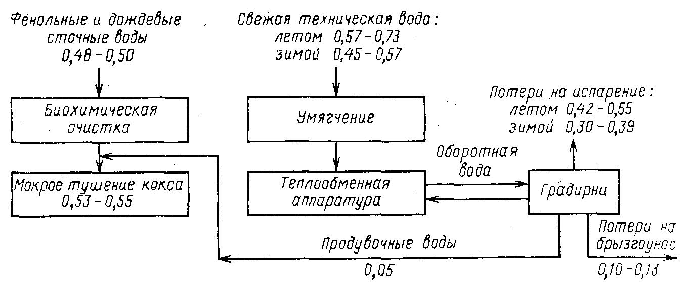 Вопросы организации бессточного коксохимического производства. На многих предприятиях пока сохраняется стадия мокрого тушения кокса. При этом испаряется 0,5–0,6 м3 воды на 1 т кокса. Таким образом, при подаче очищенной воды на тушение кокса коксохимическое производство становится бессточным. При этом можно утилизовать также продувочные воды системы производственно-технического водоснабжения коксохимического предприятия (рис. 4).