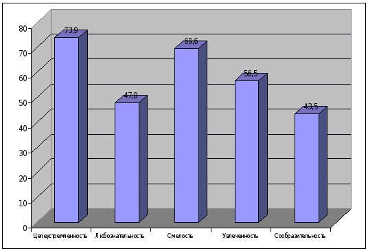 Таким образом, мы можем сделать вывод, что исходя из результатов анкетирования учащихся разработанные курс «Технология проектного метода в обучении экономике» позволяет учащимся говорить о достаточной сформированности таких качеств творческой личности как целеустремленность, смелость, увлеченность, любознательность и сообразительность. Развитию же других качеств следует уделять более пристальное внимание, с помощью использования разнообразных заданий и уроков для студентов в рамках данного курса.