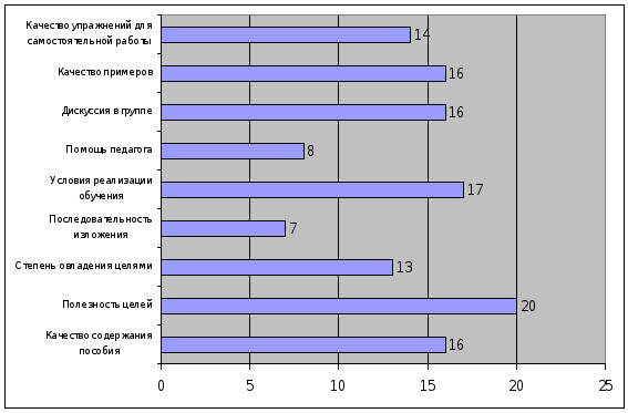 Из данных рисунка 1 мы можем сделать следующий вывод. Студентами ПУ-49 в целом высоко оценен курс «Технология проектного метода в обучении экономике». Наиболее значимые результаты ответов можно отметить по следующим позициям: полезность целей курса – 20 ответов, условия реализации обучения – 17. Одинаковое количество ответов (16) набрали следующие позиции: качество примеров, дискуссия в группе, качество содержания пособия. Наименьшие результаты отмечаются по позициям ответов: последовательность изложения (7), помощь педагога (8). Педагогам и воспитателям ПУ-49 стоит обратить внимание на данные пункты и в будущем уделить внимание разработке именно этих сторон проекта.