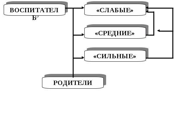 Особый подход необходим к «слабым» детям. Учитывая их психические и физические особенности, я стараюсь внушить им уверенность в себе, подвести к самостоятельному решению простых задач. В случае быстрого утомления, вид деятельности сменяется. С родителями ведется широкая консультационная работа. Особую роль играют «сильные» дети: отлично справившись с конкретной задачей они, по моей просьбе (или самостоятельно) «подключаются» к тем, кто испытывает серьезные трудности.