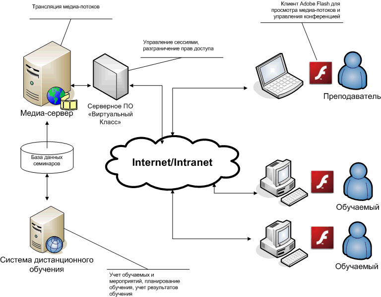 Наибольшие перспективы дистанционного обучения связаны с интеграцией телекоммуникационных и компьютерных Интернет-технологий, одним из видов которой являются электронные интерактивные видеоконференции. Интерактивная обучающая видеоконференция представляет собой одну из наиболее передовых технологий дистантного обучения и обеспечивает распределенную онлайновую связь обучающих и обучаемых, независимо от их пространственного и географического местоположения. Интерактивная мультимедийная видеоконференция обеспечивает технические условия организации глобальной образовательной сети распределенной аудитории обучающихся. Объединение сотрудников университетов универсальными цифровыми информационными магистралями ведет к формированию глобальной универсальной образовательной сети гипермедиа, объединяющей обучающих и обучаемых, потребителей и производителей знаний.