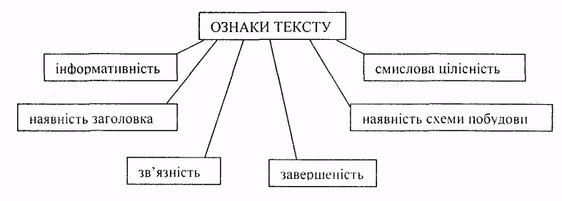 Текст – це група речень, об'єднаних загальним змістом і структурою. Проблема тексту виникає там, де є, як мінімум, два речення. Які ж ознаки характерні для тексту? Кількість ознак і їх характеристики, що називаються дослідниками мовлення (М.С.Вашуленко, І.П.Ґудзик, Н.Ф.Скрипченко та ін.) не завжди збігаються. Розглянемо ті, які, на наш погляд, є необхідними і достатніми для усвідомлення цього поняття в школі. До таких вчені відносять: