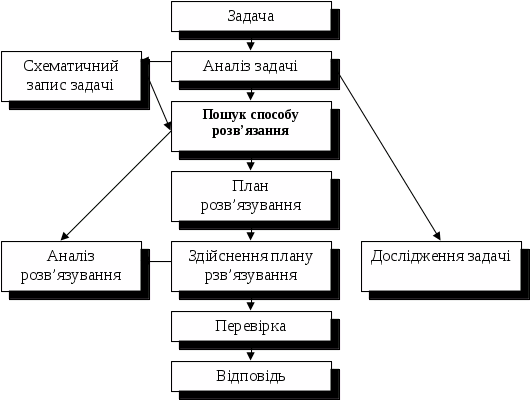 Важливим елементом задачі, що дає змогу досягти мети, є розв’язування, тобто процес перетворення її умови, який здійснюється на основі знань з тієї галузі, до якої належить задача, певних логічних правил виводу і особливих правил евристичного характеру. Цей процес складається з таких етапів: аналіз задачі, пошук плану розв'язування; здійснення знайденого плану розв'язування (розв'язання); з'ясування, що здобутий результат задовольняє вимогу задачі (перевірка розв'язання); аналіз розв'язування (з'ясування прийомів розв'язування, розгляд інших способів розв'язування). При цьому виділяють здебільшого такі чотири етапи: ознайомлення із змістом задачі; аналіз задачі і відшукання плану розв'язування; розв'язання задачі; перевірка розв'язування задачі.
