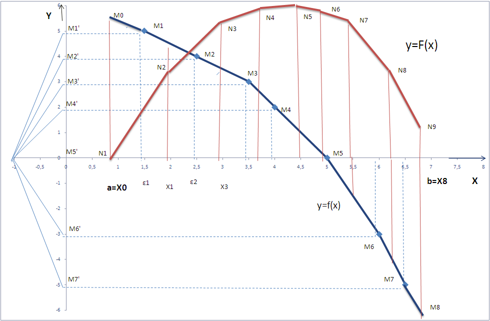 Рис.3.1 Графічне інтегрування функції f (x) з отриманням первісної функції F (x) [2]