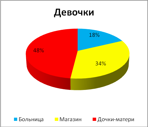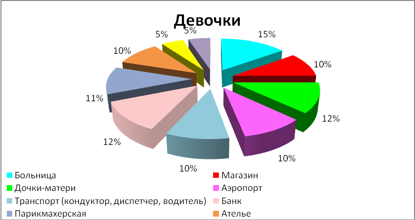 Как видно из диаграмм, сюжеты игр у детей стали намного разнообразнее. Девочки отдавали предпочтения как играм, характерным для них так и не характерным (водитель такси, торговый представитель).