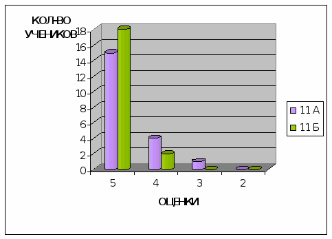 Для констатации результата после проведения разработанных занятий были проведены контрольные работы, которые приведены в главе III. Результаты эксперимента в школе приведены в диаграммах, отражающих изменения качества знаний и успеваемости в контрольном (11 б) и экспериментальном (11 а) классах.