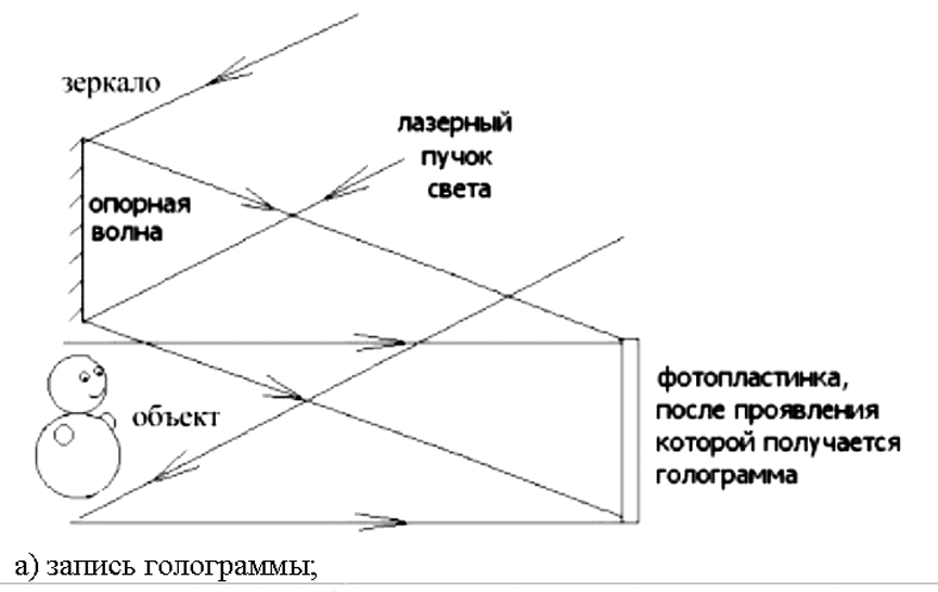 Голография (от греческого holos - весь, полный, grapho - пишу) - способ записи и восстановления волнового поля, основанный на регистрации интерференционной картины, которая образована волной, отраженной предметом, освещаемым источником света (предметная волна), и когерентной с ней волной, идущей непосредственно от источника света (опорная волна). Зарегистрированная интерференционная картина называется голограммой.