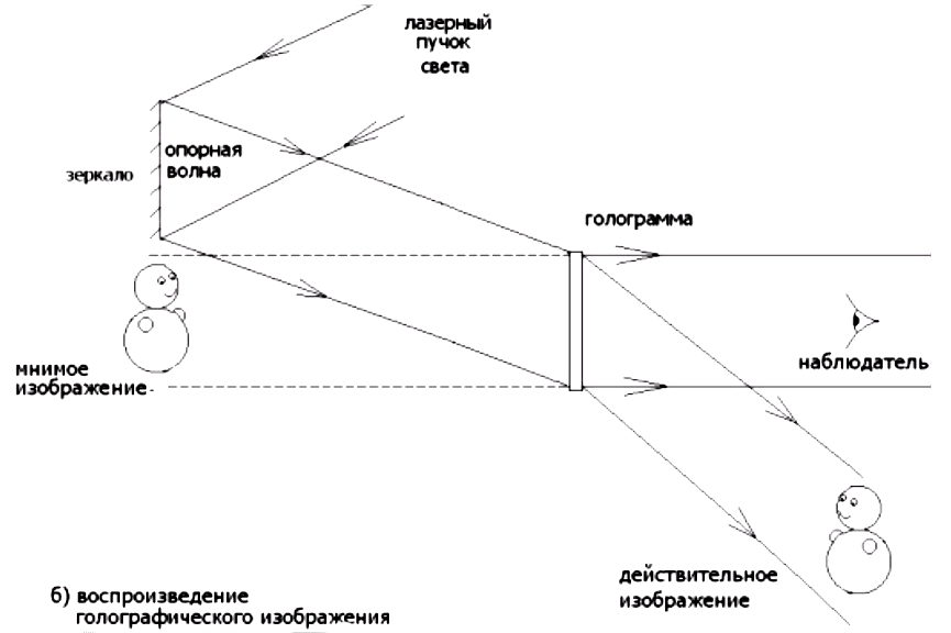 Голограмма, освещенная опорной волной, создает такое же амплитудно-фазовое пространственное распределение волнового поля, которое создавала при записи предметная волна. Таким образом, голограмма, за счет дифракции опорной волны на записанной в ней интерференционной картине, преобразует опорную волну в копию предметной.