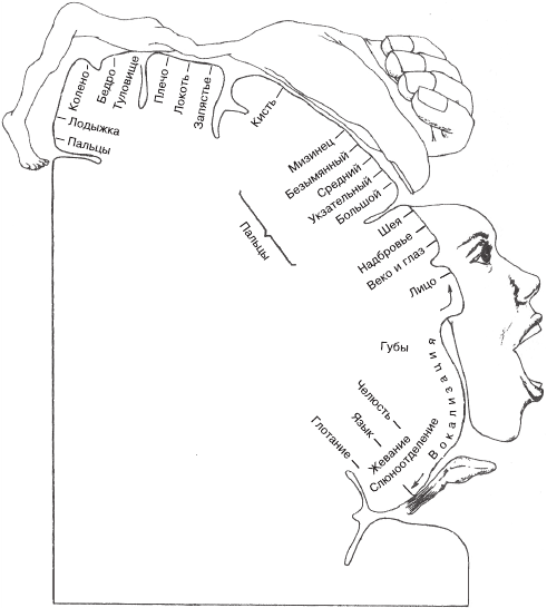 В коре больших полушарий находятся как чувствительные, так и двигательные (моторные) зоны. Последние располагаются в лобной доле коры больших полушарий, причем каждый участок коры соответствует определенной группе скелетной мускулатуры. Соответствие между определенными зонами коры и мышцами впервые установил ученый Пенфилд, составивший соответствующую карту мозга. Получившийся при этом образ человека был назван по его имени - "человечком Пенфилда" (рис.6).