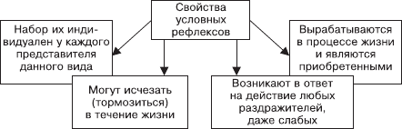 Условные рефлексы. Рефлексы, приобретаемые организмом в течение жизни и образующиеся в результате сочетания безразличных раздражителей с безусловными, И.П. Павлов назвал условными рефлексами. Каждый взрослый индивид обладает целым набором условных рефлексов, причем все они обладают рядом общих свойств (рис.11), обусловленных как прижизненным характером их возникновения, так и способом фиксации в нервной системе (на уровне синаптических связей).
