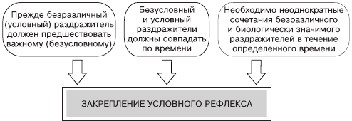Условные рефлексы возникают на базе безусловных в случае периодического сочетания какого-то важного для организма события с другим, безразличным для организма. Для возникновения и закрепления условного рефлекса необходимо выполнение ряда условий (рис.12).