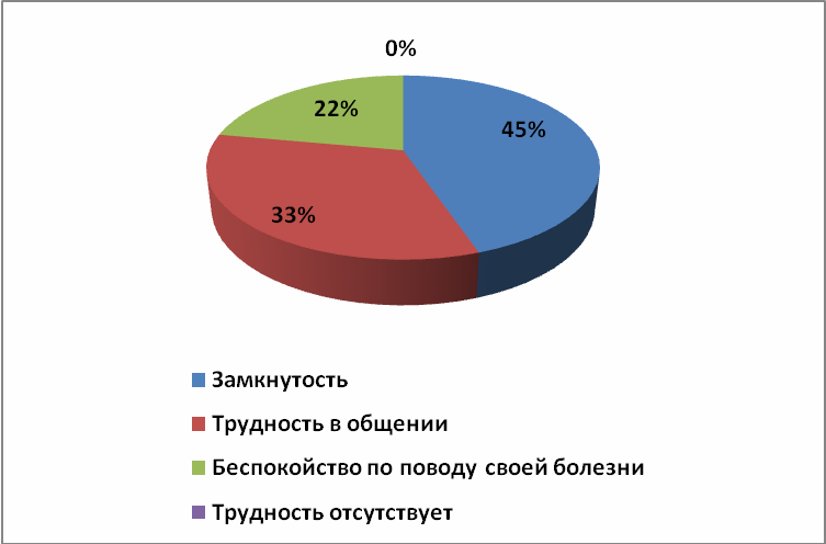 Из диаграммы видно, что у всех детей возникают трудности в выборе профессии. Самыми актуальными являются замкнутость и трудность в общении. И 22 процента детей, выбирая профессию, беспокоятся по поводу своей болезни. Для устранения данных трудностей важна работа социального педагога, чтобы при поступлении дети не задумывались о своих недостатках.