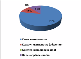 Исходя из диаграммы, можно сказать, что дети не осознают важности таких качеств, как коммуникабельность, креативность и целенаправленность. Но самым главным качеством, по их мнению, которым должен обладать выпускник – это самостоятельность.Сразу с поступления в школу, учителя стараются привить детям самостоятельность во всём: в учёбе, в интернатных (домашних) условиях и на улице. В результате, у детей качество самостоятельности встаёт на первое место.