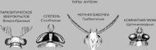 РИС.3 Типы антенн. 1. Нитевидные. 2. Булавовидные. 3. Пластинчатые. 4. Веерообразные. 5. Столбчатые. 6. Гребенчатые. 7. Щетиновидные.