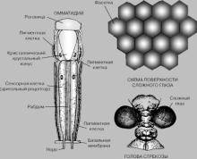 Сложные фасеточные глаза состоят из отдельных глазков – омматидиев, глазок покрыт прозрачной роговицей, которая имеет вид выпуклого шестигранника (фасетки). Под роговицей находится так называемый хрустальный (кристаллический) конус, вместе они образуют линзу глазка. Свет воспринимают рецепторные (ретинальные) клетки. Их чувствительные части – рабдомеры – расположены в центральной части глазка и образуют светочувствительный элемент – рабдом. По краям лежат пигментные клетки, изолирующие один глазок от другого.