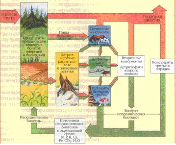 Вещество и энергия с пищей передаются от продуцентов к консументам первого, второго, третьего порядка, затем – к редуцентам. Но при переходе от одного трофического уровня к другому часть энергии теряется, превращаясь в тепловую (включая затраты на дыхание и другие жизненно важные процессы). Существование экосистемы поддерживается благодаря непрерывному притоку энергии солнца к продуцентам – зеленым растениям.