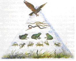 Рис 2. Упрощенная пирамида чисел, или экологическая пирамида: кузнечики поедают зеленые растения, лягушки - кузнечиков, змеи – лягушек, орел – змей.