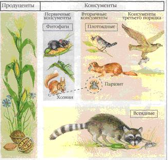 В экосистемах группы видов последовательно связаны между собой как хищник и жертва. В любой экосистеме есть первичные консументы (производители) органического вещества – организмы-автотрофы (в основном это зеленые растения). Они в свою очередь служат пищей для разнообразных организмов-гетеротрофов – всех животных, грибов, некоторых микроорганизмов. Среди них выделяют первичных консументов (потребителей) – растительноядных животных (например, кузнечики среди насекомых, копытные среди млекопитающих) и вторичных консументов, или собственно хищников, разных рангов, разного порядка, поедающих других животных. Получается, что живые существа, относящиеся к самым разным систематическим группам, могут играть в экосистемах одну и ту же роль, так как принадлежат к одному и тому же пищевому, или трофическому, уровню.
