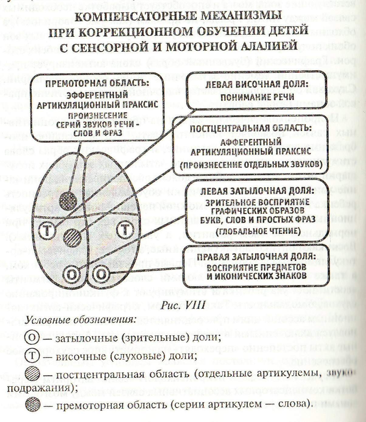 Т.Г. Визель так описывает механизм компенсации через зрительный анализатор. Ребенок видит одновременно картинку, слово, написанное крупными буквами, и слышит, как его произносит обучающий. Слова должны соответствовать возрасту ребенка, изображения – тоже. Маленькому ребенку желательно предъявлять сугубо реалистические картинки, детям постарше – с элементами стилизации. Одновременное обыгрывание слова в разных модальностях активизирует соответствующие зоны мозга и способствует выработке связей между ними, правда, не прямым, а обходным путем. Картинка стимулирует работу затылочных зон обоих полушарий, а ее осмысление – лобных долей с обеих сторон. Графический образ слова активизирует преимущественно теменно-затылочные зоны обоих полушарий. Слуховой образ обрабатывается височной левой и частично правой зонами (абрис слова). Физиологически обусловленная потребность ребенка говорить делает возможной перешифровку в артикуляционные движения не услышанных слов, как это бывает при нормальном речевом развитии, а увиденных, прочитанных. Возникают оптико-артикуляционные и графически-артикуляционные ассоциации. Первые произнесенные ребенком, а также обучающими его людьми слова и их фрагменты достигают уха ребенка и стимулируют слуховую модальность. Таким образом, к графически-артикуляционным ассоциациям присоединяются слуховые, которые становятся включенными в речевую деятельность. Артикуляционные акты постепенно переходят на нормативное слухоречевое обеспечение. (Т.Г. Визель, [3], с.253). При коррекционной работе необходимо также задействовать тактильный анализатор, развивать мелкую моторику, преодолевать неречевые нарушения: развивать анализ, синтез, внимания, восприятия, обобщения, противопоставления. Все это составит необходимый фундамент для речевого развития.