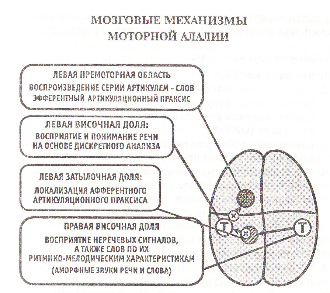 Н.Н. Трауготт, изучая слух детей с сенсорной алалией, обнаружила, что слуховой гнозис правого полушария у них тоже неполноценен. Она считала, что наблюдаемые у них непостоянство реакций на звуки, особенно незнакомые, истощаемость реакций, легкая тормозимость последних являются следствием неполноценности кортикального отдела слухового анализатора, проявлением дефекта замыкательной функции. Н.Н. Трауготт назвала эту патологию «замыкательная акупатия». (Н.Н. Трауготт [13], с.11). Она писала, что родители замечают у этих детей невнимание к звукам, ребенок зачастую не реагирует на оклик, громкий звонок; кажется, что он не слышит этих звуков. Дети не пытаются слушать, проявляют мало интереса к речи окружающих. Затруднение в образовании условных рефлексов на звуки, нестойкость звуковых условных рефлексов создают у ребенка установку ориентироваться в окружающем мире с помощью других, полноценных анализаторов. Пропадает интерес к миру звуков, ребенок становится индифферентным к звуковым раздражителям. Звуки не имеют для детей значения, не связаны со смыслом. Замечено, что привычные, знакомые звуки все же приобретают смысловое значение, их ребенок слышит лучше. Так, например, голос матери дети слышат, а на голоса незнакомых людей не реагируют. На звук игрушки ребенок реагирует лучше в том случае, если эта игрушка была ему раньше показана и вызвала его интерес. (Н.Н. Трауготт [13], с.10). Н.Н. Трауготт размышляла о замыкании условных связей и следовых процессах анализаторов. Она заметила, что они взаимосвязаны и взаимообусловлены. Однако то, что в патологических условиях они могут нарушаться независимо друг от друга, говорит об их относительной самостоятельности. Так, например, снижение активности неспецифических систем мозга преимущественно сказывается на функции сохранения следов и мало отражается на возможности замыкания условных связей. При сенсорной алалии страдают обе функции. (Н.Н. Трауготт [13], с.92). Исследуя слух детей с сенсорной алалией и афазией, а также взрослых с афазией, Н.Н. Трауготт обнаружила интересную закономерность. У детей с алалией и афазией всегда констатируется понижение остроты слуха, тогда как при сенсорной афазии взрослых данные тональной аудиометрии оказываются близкими к возрастной норме. Объяснения этому она найти не смогла. (Н.Н. Трауготт [13], с.157). Механизм моторной алалии Т.Г. Визель изображает следующим образом: