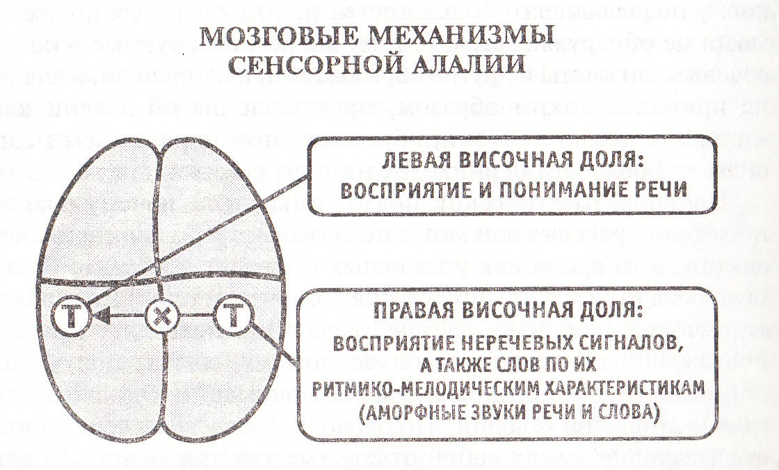 Т.Г. Визель пишет, что при сенсорной алалии отсутствуют необходимые связи между правым и левым полушариями. Рисунок (Т.Г. Визель, [3], с.178). Крестиком показано нарушение связи.