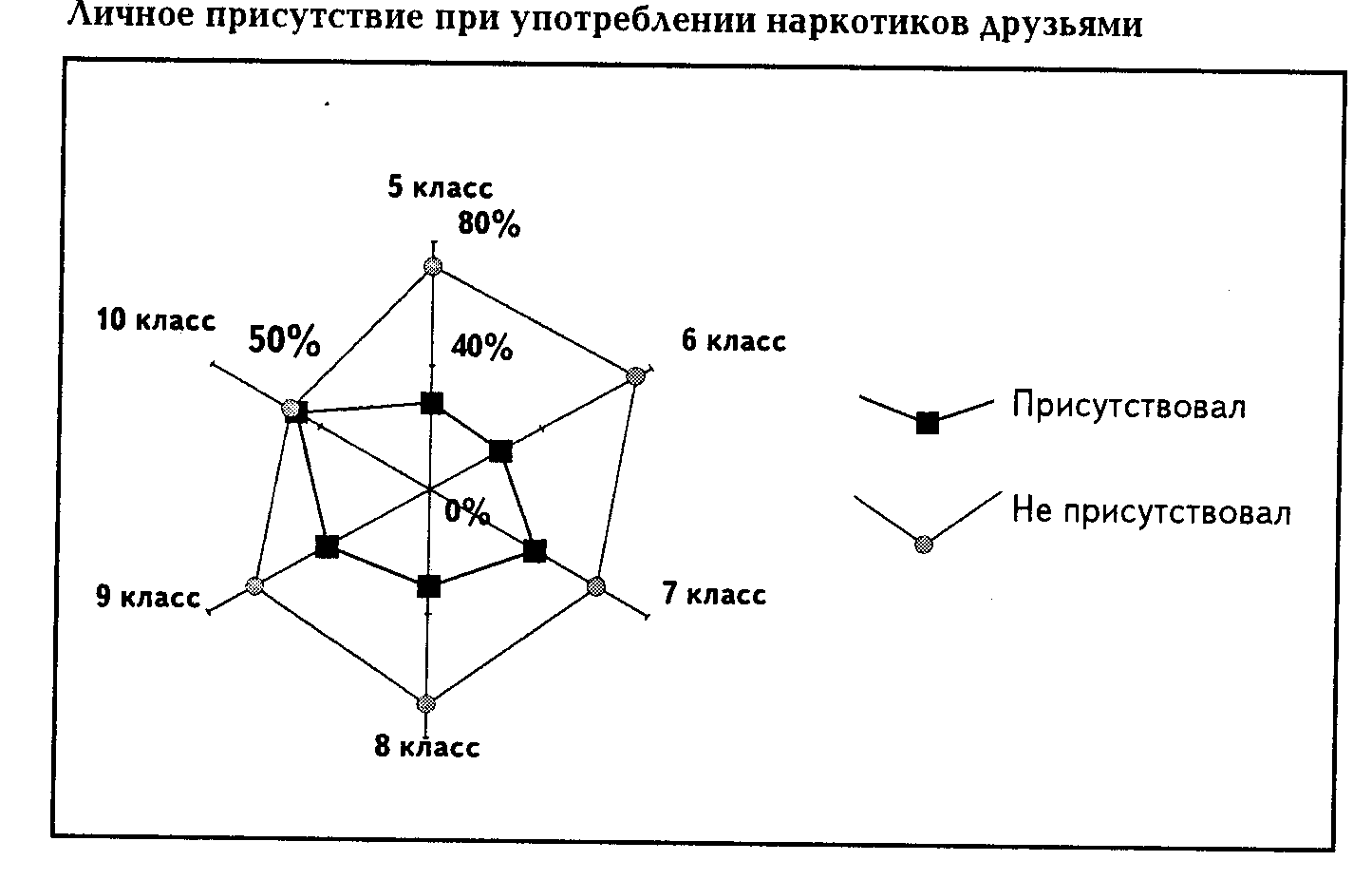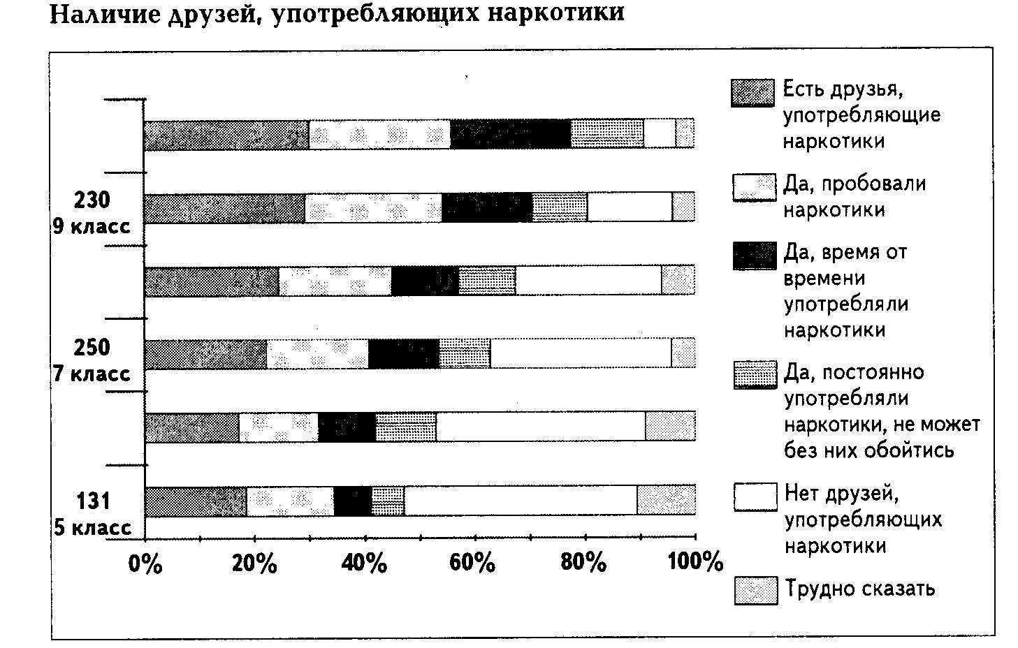 Этот вывод подтверждает и данные о том, что 38% подростков не просто знают о том, что их друзья употребляют наркотики. Но и лично присутствовали при этом. Среди десятиклассников каждый второй видел, как его друзья употребляют наркотики. Таким образом, к десятому классу доля тех. Кто втянут в круг друзей и знакомых, где употребляют наркотики, достигает 50% (Приложение 1,)