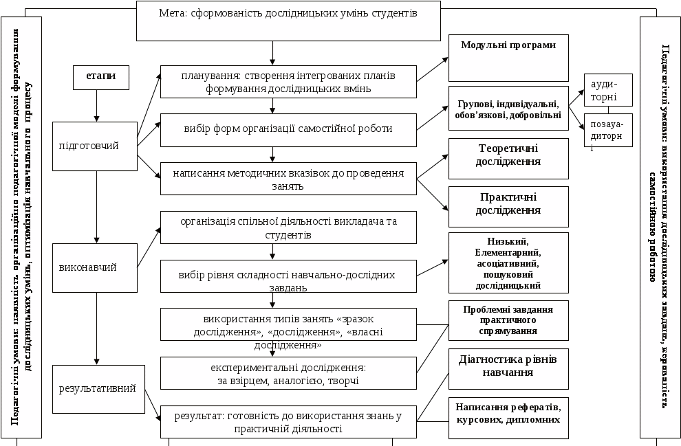 Реалізація всіх етапів забезпечується відповідними умовами: наявність організаційної моделі формування дослідницьких умінь з дисциплін природничо-математичного циклу; оптимізація навчального процесу шляхом упровадження модульно-рейтингової технології; використання дослідницьких завдань технологічного, економічного, екологічного, агрохімічного змісту, що відображає специфіку підготовки спеціалістів ВНЗ; керованість самостійною роботою студентів. Результати досліджень показали ефективність запропонованої моделі організації дослідницької діяльності студентів.