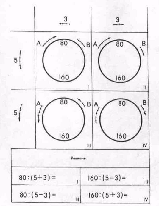 Весьма поучительно решение следующей четверки задач, исчерпывающих все возможные комбинации направлений движения двух тел относительно друг друга (рис.7). Вопрос для всех задач общий: через сколько секунд А и В окажутся рядом? Итак, дана задача: «Между двумя точками А и В имеются две дороги, длинная — 160 м и короткая — 80 м. Из этих точек движутся два велосипедиста со скоростями 5 и 3 м в секунду. Через сколько секунд они окажутся рядом? (Рассмотреть все возможные случаи.)»