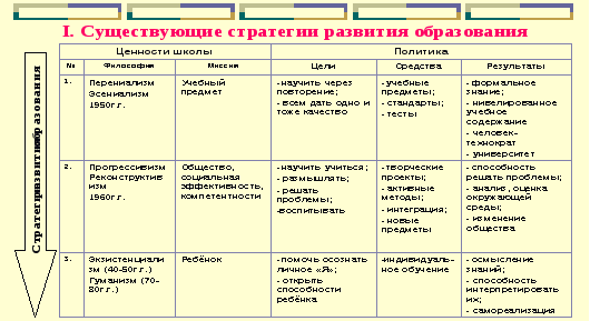 Мы начали осмысление состояния регионального образования с анализа стратегий развития педагогических процессов и систем, предлагаемых в Республике, как ответ на вызовы времени. Наш вывод - стратегические направления развития системы образования РК направлены на разработку содержания [4]: