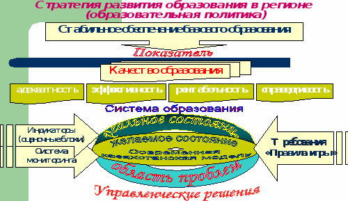 По существу стратегия заявляет логику управления развитием содержания регионального образования и отражает процедуру управления качеством образования в регионе. Что означает эта логика: прежде всего, то, что качество образования не появляется внезапно. Его необходимо проектировать [3]. То есть, прежде всего, необходимо осмысление стратегий развития педагогических процессов и систем, когда на основе анализа реального состояния и современных требований создается новый облик системы. Именно новый облик системы образования становится основой теоретической модели системы педагогического мониторинга, его индикаторов и оценочных блоков, а значит и первым шагом на пути управления качеством образования.