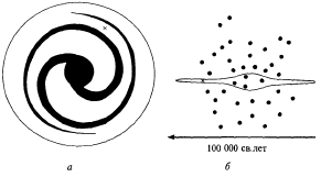 Млечный Путь хорошо виден в безлунную ночь. Он кажется скоплением светящихся туманных масс, протянувшимся от одной стороны горизонта до другой. Наблюдая Млечный Путь в телескоп, мы обнаруживаем, что он состоит из множества звезд. По форме он напоминает сплюснутый шар, заполненный 150 млрд. звезд, В центре его находится ядро, от которого отходит несколько спиральных звездных ветвей, что придает нашей Галактике спиральную форму. Наша Галактика чрезвычайно велика: от одного ее края до другого световой луч путешествует около 100 тыс. земных лет. Большая часть ее звезд сосредоточена в гигантском диске толщиной около 1500 световых лет. На расстоянии около 30 тыс. световых лет от центра Галактики расположено наше Солнце.
