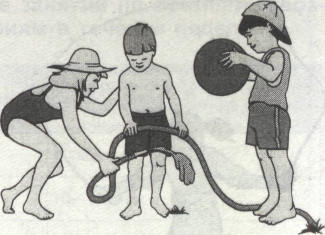 1. Уносяцца аднолькавыя прадметы для ycix дзяцей (напрыклад, абручы), але рухі дзеці павтны выконваць розныя: адзін выконвае з абручом розныя віды хадзьбы, другі - скачкоу, трэці — бегу i г.д.