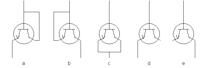 Діоди b і e – на основі колекторного переходу мають найбільшу зворотну напругу. На основі емітерного переходу (а, d) – мають найбільшу швидкодію і найменший зворотний струм. На основі паралельного включення переходів (с) – найменшу швидкодію і найбільший прямий струм.