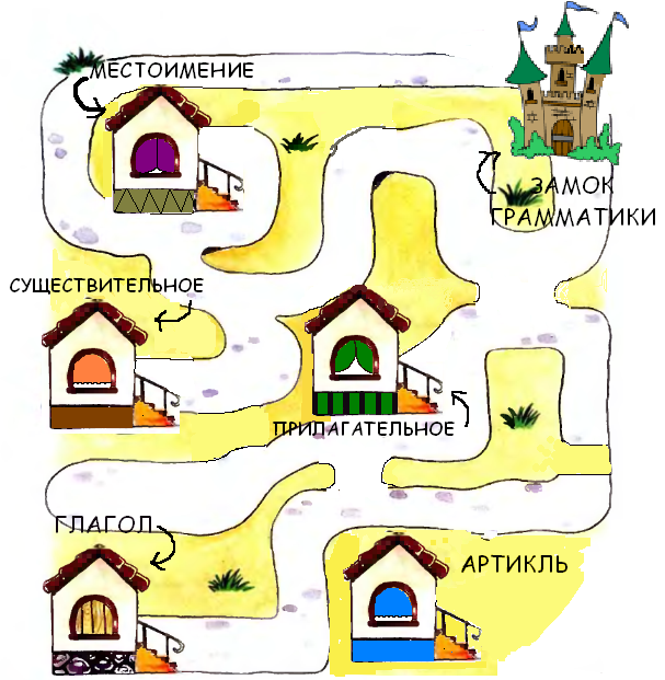 Дети, послушайте внимательно. Сегодня я расскажу вам о замечательной стране. Я думаю, вы о ней никогда не слышали. Послушайте какое у нее красивое название: “La Grammaire”. Но в этой стране живут не обычные люди, как мы с вами, а части речи Они живут в своих уютных домиках (учитель указывает на нарисованные домики или на макеты домиков, подписанные существительное, глагол и т.п.). Вот это домик существительных. Там живут слова, которые вы уже знаете: une table, un bureau, un cahier. А теперь давайте постучимся в домик прилагательных. Там мы встретим прилагательные rouge, joli, grand. А вот особенный домик, это домик глаголов. Они все что-то делают, чем-то занимаются. Вот они: penser, parler, écouter. Мы еще не раз будем приходить к ним в гости и смотреть, чем же они заняты в своей маленькой стране.