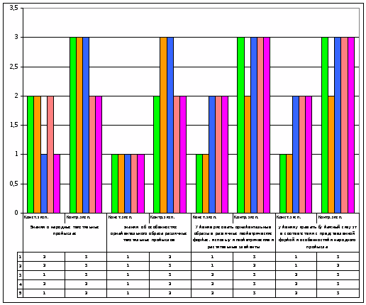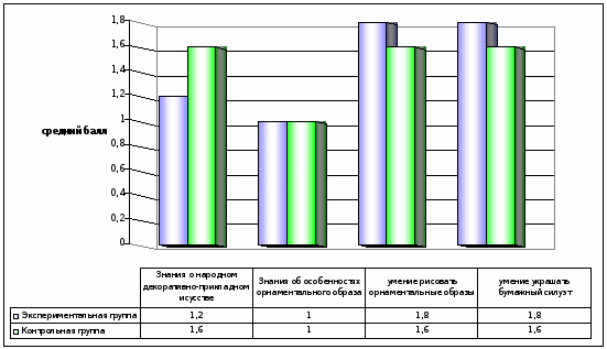 У детей контрольной группы отличительные успехи незначительные. Такие результаты говорят о том, что формирование орнаментального образа у детей данной группы проводится без определенной системы занятия с детьми разного уровня развития. Работы детей не смогли достичь высшего уровня, вследствие недостаточного усвоения основ формирования орнаментального образа.
